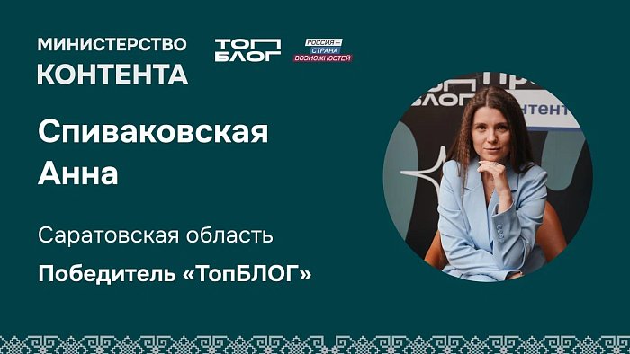 Названы имена победителей основного трека Всероссийского проекта «ТопБЛОГ» Президентской платформы «Россия – страна возможностей». 30 участников из 15 регионов России стали лучшими авторами программы «Министерство контента», объединившей блогеров и государственных служащих. В число победителей вошла доцент Саратовского государственного медицинского университета имени В. И. Разумовского, кандидат медицинских наук Анна Спиваковская.