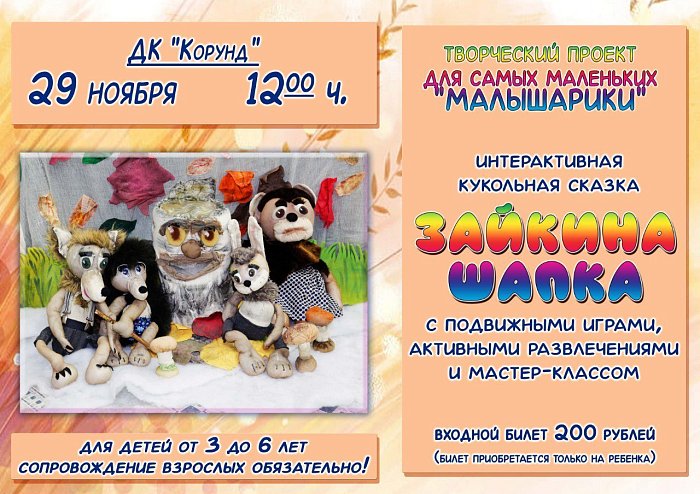 Дорогие друзья! В эту субботу, 29 ноября в 12 часов "народный коллектив" театр кукол "Балаганчик" приглашает наших самых маленьких зрителей на интерактивную кукольную сказку "Зайкина шапка".