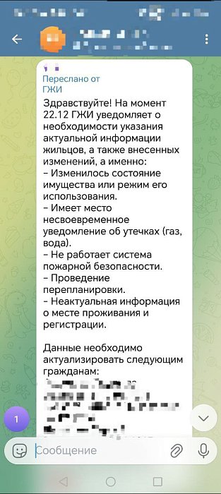 Уважаемые жители региона! Обращаем ваше внимание на то, что вновь участились случаи обращения мошенников от лица Госжилинспекции (ГЖИ) в личных сообщениях и домовых чатах в мессенджере Telegram