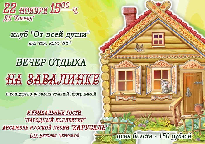 Дорогие друзья! Мы приглашаем вас на вечер отдыха "На завалинке". Обещаем хорошее настроение, ароматный чай с вкусными печеньками и общение в кругу друзей! Концертную программу подарят приглашенные гости - "народный коллектив" ансамбль русской песни "Карусель" Дома культуры п. Верхняя Чернавка.