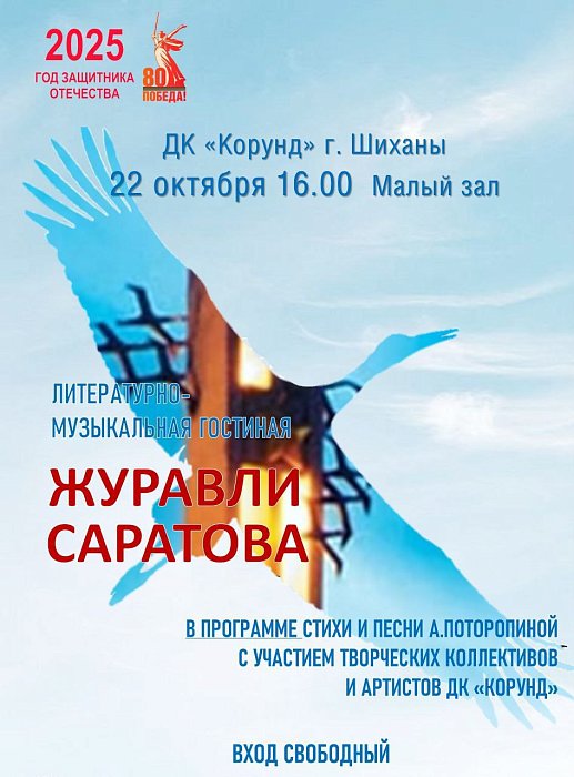 Мы нашу программу посвящаем "Журавлям Саратова". 22 октября в 16 часов (среда) состоится поэтический творческий вечер шиханского поэта Алены Поторопиной. В программе авторское чтение стихов с участием творческих коллективов и артистов Дворца культуры "Корунд". Вход свободный.