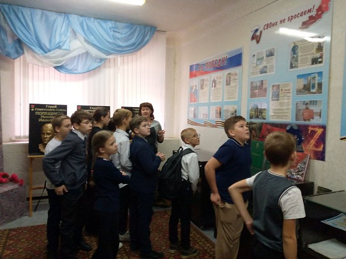 Ребята познакомились со стендом, посвященным нашему земляку – Герою России Александру Потапову, погибшему при выполнении боевых задач в ходе специальной военной операции по защите мирного населения Донбасса.