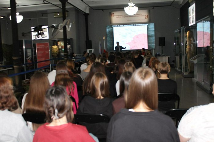 В музее СВО в рамках цикла мероприятий «Время героев» прошла встреча с участником СВО Данилой Максимовым, который является экскурсоводом музея. Он участвовал в спецоперации в составе добровольческого подразделения «Барс-15» с ноября 2024 г. по апрель 2025 г., служил на Покровско-Мирноградском направлении.